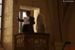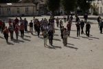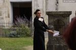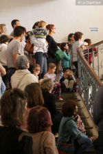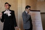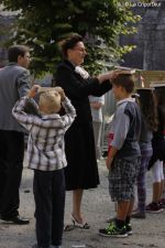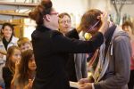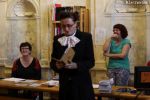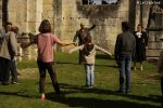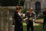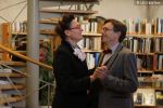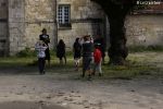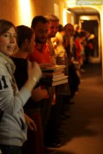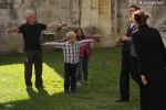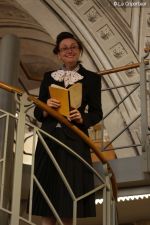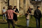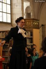 Accueillis dans la cour de l’Abbaye, un surveillant fut choisi au hasard, revêtu d’une blouse grise et armé d’un sifflet, l’une des qualités d’un bon bibliothécaire étant… la discipline ! Angélique Boutonne a su convaincre l’auditoire de la nécessité d’avoir un certain sens de l’accueil : boudoirs bien secs et fond musical militaire n’ont pas manqué de mettre l’auditoire à l’aise. Michel Saudau quant à lui s’est octroyé quelques petites boutades de haut niveau en rappelant la joie de son ancêtre Louis-Claude Saudau, archiviste angérien, lorsque celui-ci eut terminé de ranger la bibliothèque léguée par le maire Joseph Lair en s’écriant « le fonds de Lair est fait ! ». Après un passage dans le hall d’entrée de l’abbaye qui renferme également le Centre de Culture Européenne, nos deux bibliothécaires ont emmené les participants vers les tours de l’Abbaye où ils ont déclamé quelques passages de Molière et mis en scène la fameuse scène de Hamlet « Etre ou ne pas être » (la vidéo ne saurait tarder… !). Angélique n’a pu retenir son émotion lors de l’épreuve du « silence » (autre vertu nécessaire au bibliothécaire) durant laquelle les participants ont formé une chaîne humaine le long d’un tunnel de l’édifice, se passant sans mot dire (mais en pouffant, cela va de soi) une pile de livres. La session se terminait dans la médiathèque abritée dans l’une des plus belles salles de l’abbaye avec une dernière épreuve, « la course au livre », visant à tester la réactivité des futurs bibliothécaires.