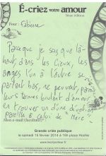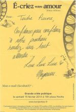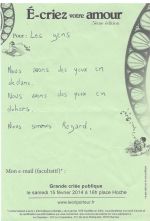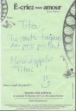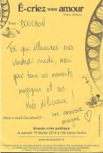 Depuis le lancement du festival le 1er février, la grisaille et les intempéries s’étaient invités sur la ville. L’Amour a malgré tout inspiré les Rennais qui se sont prêté avec beaucoup d’enthousiasme au jeu de l’écriture. 972 messages ont été recueillis cette année dans la cinquantaine de lieux participants : cafés, bars, restaurants, commerces, agence STAR, MJC, bibliothèques… Amour pluvieux, amour heureux, pourrait-on dire.